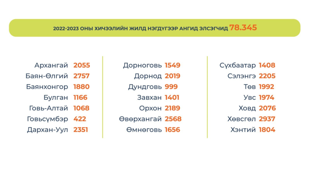 Энэ хичээлийн жилд Ерөнхий боловсролын сургуульд 750.661 хүүхэд суралцана. 12 дугаар ангийг 33 мянган хүүхэд төгсөж байгаа бол нэгдүгээр ангид 78 мянган сурагч элсэж байна.
