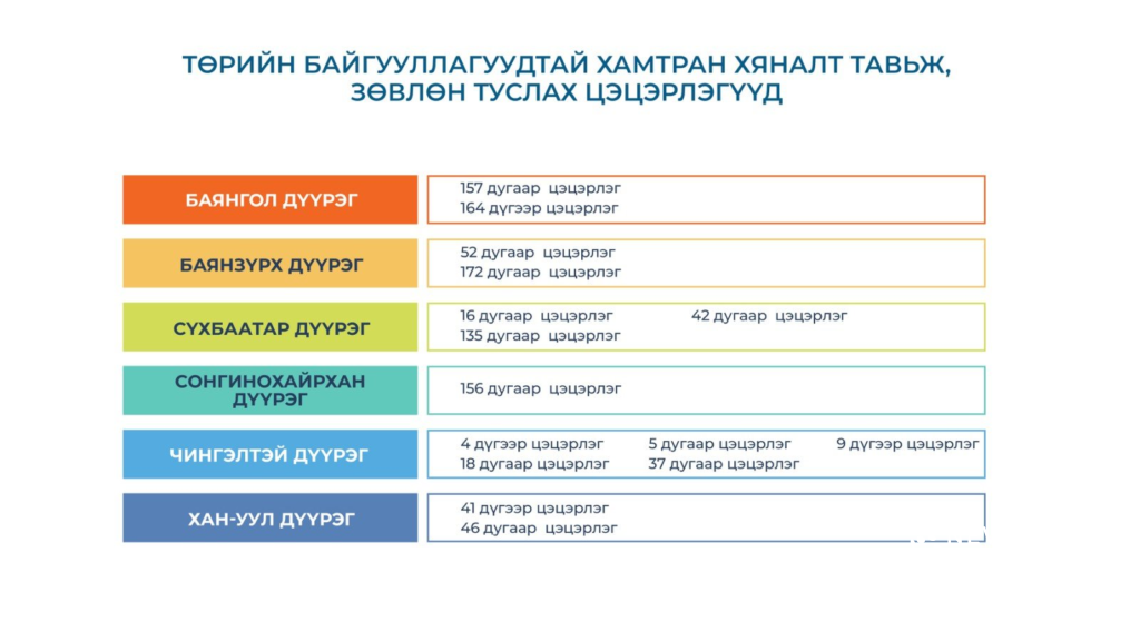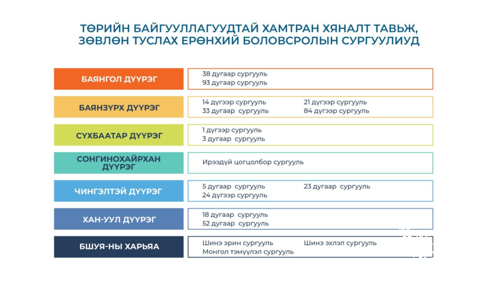 Хууль зүй, дотоод хэргийн сайдаар ахлуулсан ажлын хэсэг энэ өдрүүдэд ажиллаж байна. Ажлын хэсэг хамран сургах тойргийн дагуу хуваарилалт хийгдэж байгаа эсэхэд хяналт тавьж, зөвлөн туслах юм. Ингэхдээ иргэд хүүхдээ хамруулахаар хамгийн ихээр ханддаг 17 сургууль, 15 цэцэрлэг, төрийн өмчийн 6 их сургуулийн үйл ажиллагааг онцгойлон анхаарах юм.