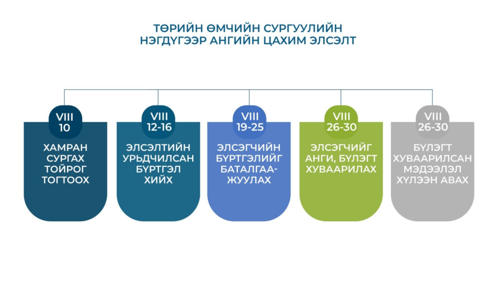Нэгдүгээр ангийн сурагчдын элсэлтийг цахимаар зохион байгуулах юм. 6 настай хүүхдүүдийн урьдчилсан хуваарилалт сургууль бүрд хийгдсэн бөгөөд эцэг эх, асран хамгаалагчид маргаашнаас эхлэн 25-ны өдрийг хүртэл И Монголиа цахим системээр нэвтэрч баталгаажуулах юм. Энэ сарын 26-30-ны өдрүүдэд таны хүүхэд аль сургуулийн аль анги, бүлэгт хуваарилагдсаныг таны утсанд мессеж илгээн мэдэгдэх юм.