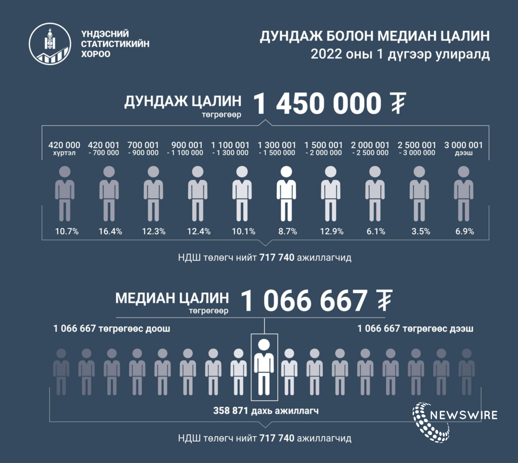 НДЕГ-ын НДШ төлөлтийн 2022 оны нэгдүгээр улирлын тайланд хамрагдсан 717.7 мянган ажиллагчдын сарын медиан цалин 1066.7 мянган төгрөг байна. Медиан цалин өмнөх оны мөн үеэс 120.9 (12.8%) мянган төгрөгөөр өссөн бол өмнөх улирлаас 1.4 (0.1%) мянган төгрөгөөр буурчээ.
