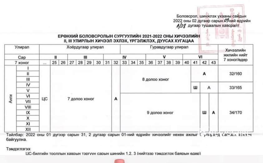 Боловсрол, шинжлэх ухааны сайдын А/38 дугаар тушаалаар Ерөнхий боловсролын сургуулийн 2021-2022 оны хичээлийн жилийн II, III дугаар улирал буюу хоёрдугаар хагас жилийн эхлэх, дуусах хугацааг тогтоосон билээ.
