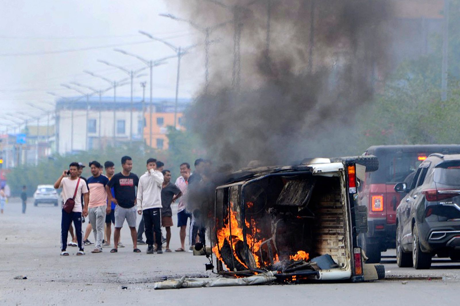 Олон байшин барилга, машин тэрэг шатаж, Импхалын гудамжнаас өтгөн хар утаа суунаглаж буй дүрс бичлэг орон нутгийн телевизээр цацагджээ.