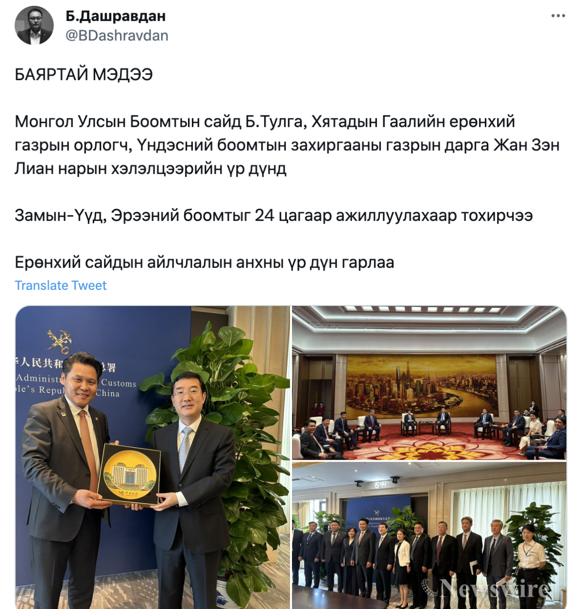 Энэ үеэр Монгол Улсын Боомтын сайд Б.Тулга, Хятадын Гаалийн ерөнхий газрын орлогч, Үндэсний боомтын захиргааны газрын дарга Жан Зэн Лиан нарын хэлэлцээрийн үр дүнд Замын-Үүд, Эрээний боомтыг 24 цагаар ажиллуулахаар тохирчээ.