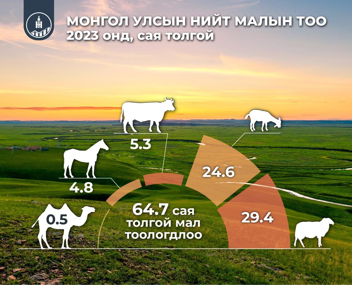 Улсын хэмжээнд 2023 оны эцэст, мал тооллогын урьдчилсан дүнгээр 64.7 сая толгой мал тооллогдлоо.