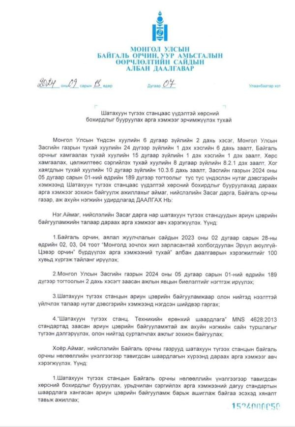 Тодруулбал, шатахуун түгээх станцаас үүдэлтэй хөрсний бохирдлыг буруулах арга хэмжээг эрчимжүүлэхээр С.Одонтуяа сайд албан даалгавар гаргасан юм.