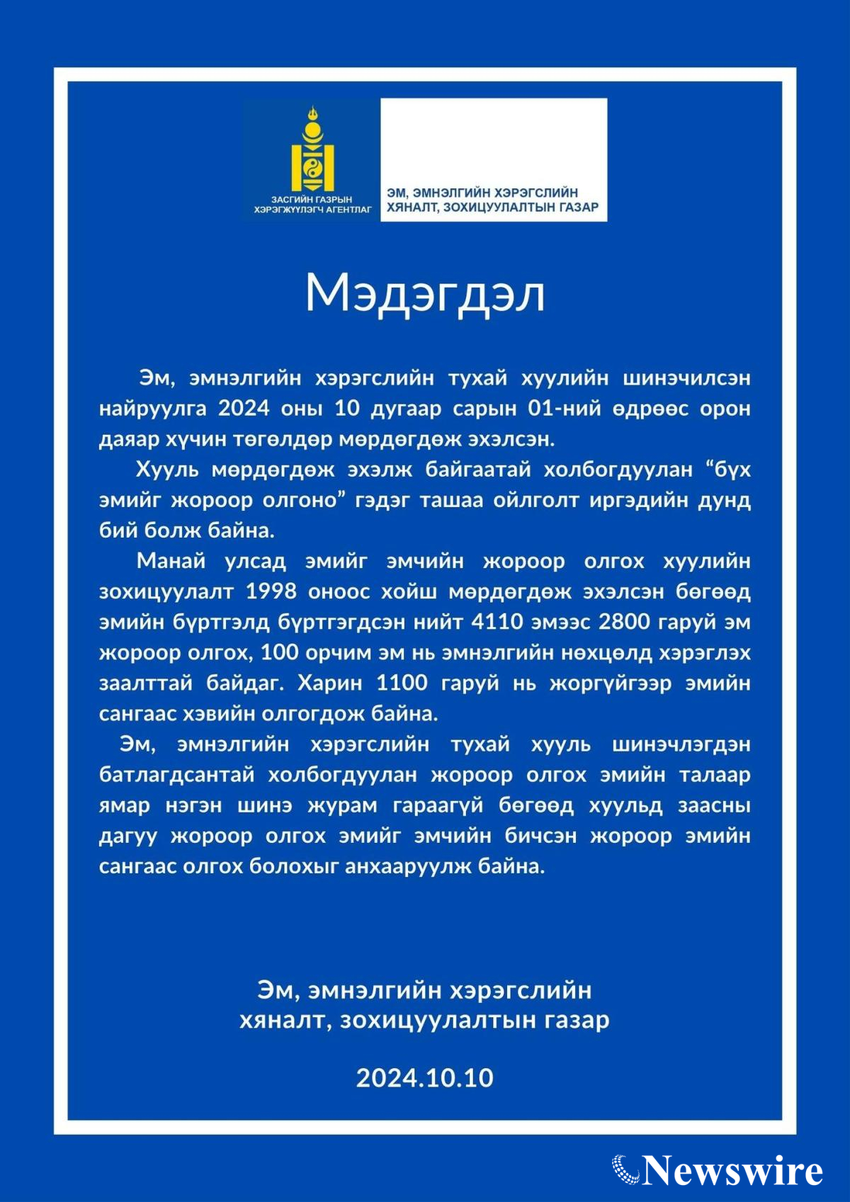 Эм, эмнэлгийн хэрэгслийн тухай хуулийн шинэчилсэн найруулга 2024 оны 10 дугаар сарын 01-ний өдрөөс орон даяар хүчин төгөлдөр мөрдөгдөж эхэлсэн.