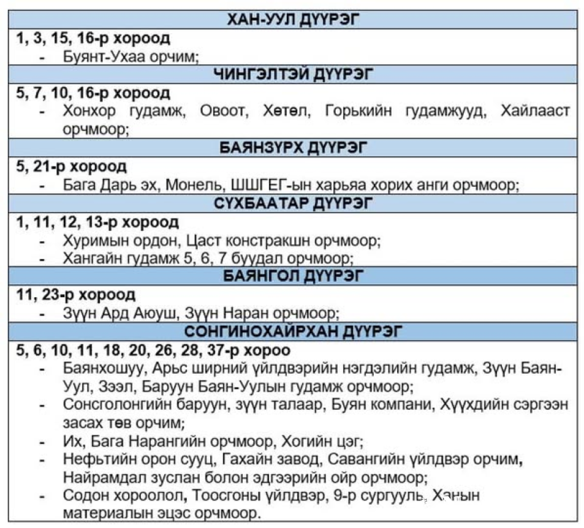 Эрчим хүчний чадлын дутагдлаас шалтгаалан 2024 оны 12 дугаар сарын 23-ны даваа гарагийн 09:00-11:00 цагийн хооронд Диспетчерийн үндэсний төв ТӨХХХК-ийн шийдвэрээр “Хязгаарлалт хийж болзошгүй” байршлуудыг мэдээлж байна.