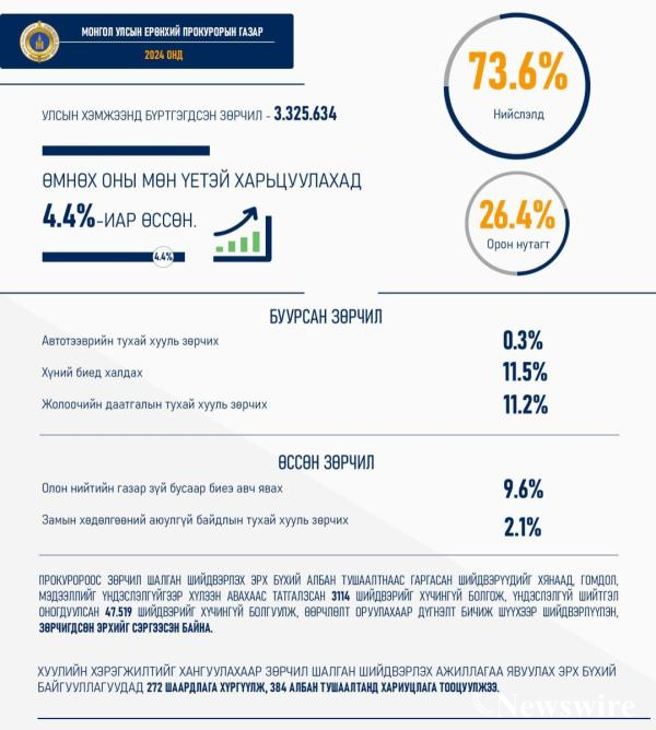 2024 онд улсын хэмжээнд 3.325.634 зөрчлийн хэрэг гарсан нь өмнөх оны мөн үетэй харьцуулахад 4.4 хувиар өсжээ. Зөрчлийн хэргийн 73.6 хувь нь Нийслэлд, 26.4 хувь нь орон нутагт бүртгэгджээ.