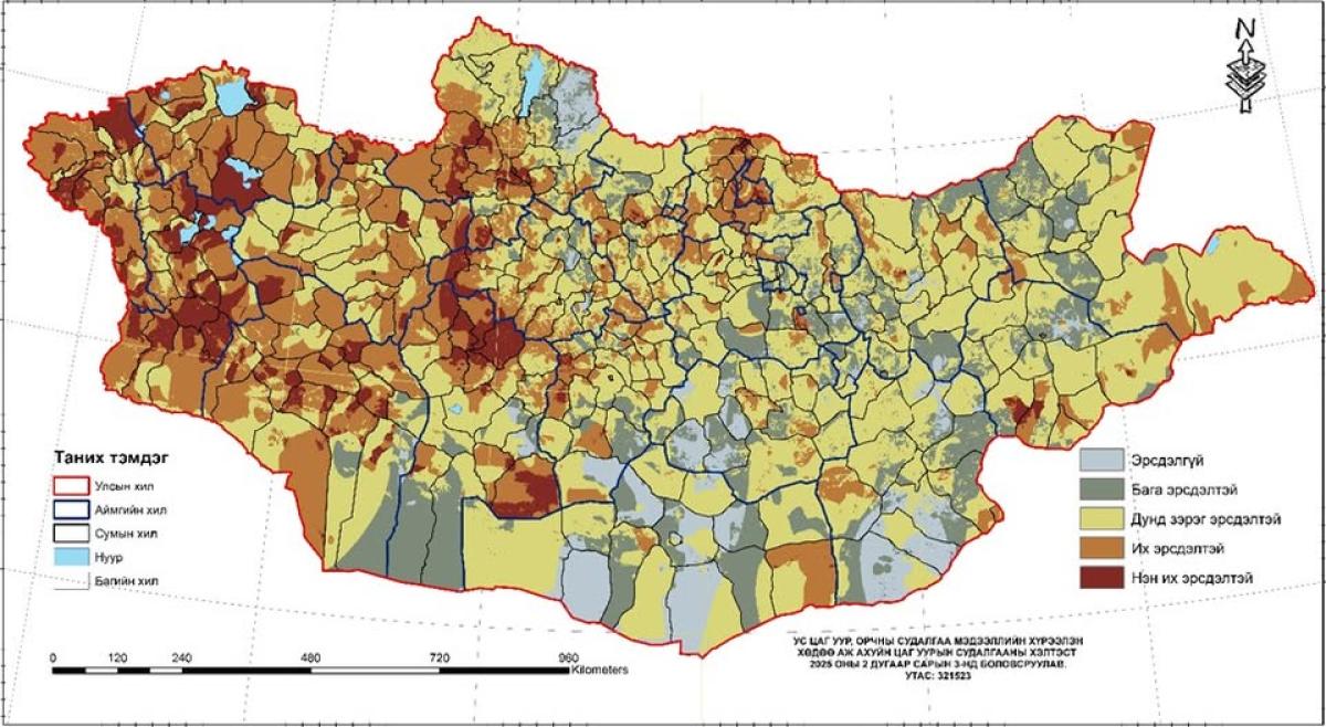 Зудын эрсдэлийг 2025 оны 1 дүгээр сарын 31-ний мэдээгээр үнэлэхэд нийт нутгийн 30 гаруй хувьд нэн их болон их, 40 гаруй хувьд нь дунд зэрэг эрсдэлтэй байгаа бол 10 гаруй хувьд бага эрсдэлтэй, 10 орчим хувьд эрсдэлгүй гарав. Аймгийн дүнгээр авч үзвэл Баян-Өлгий, Увс, Ховд, Завхан, Говь-Алтайн ихэнх, Баянхонгор, Сэлэнгэ, Хөвсгөл, Архангай, Өвөрхангайн зарим сумдын нутгаар нэн их болон их эрсдэлтэй байхаар байна. 2024 оны 12 дугаар сарын 31-нд гаргасан зудын эрсдэлийн үнэлгээтэй харьцуулбал эрсдэлгүй нутгийн хэмжээ багассан бол бага болон дунд эрсдэлтэй нутгийн хэмжээ нэмэгдсэн байна.