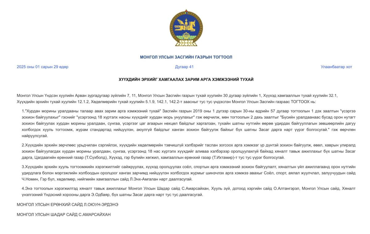 Засгийн газрын 2025 оны нэгдүгээр сарын 29-ний хуралдаанаар хэлэлцэгдсэн Өвөл, хаврын хурдан морины уралдааныг нээх эсэх асуудлаарх Засгийн газрын тогтоол албажив. Засгийн газрын 2025 оны 41 дүгээр тогтоол бүрэн эхээр нь хүргэж байна.