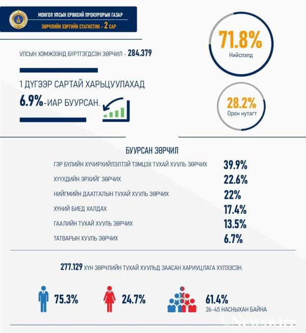 Өнгөрсөн хоёрдугаар сард үйлдэгдсэн зөрчлийг нэгдүгээр сартай харьцуулахад зарим төрлийн зөрчил буурсан дүнтэй байна. Тодруулбал, Гэр бүлийн хүчирхийлэлтэй тэмцэх тухай хууль зөрчих зөрчил 39.9 хувиар, Хүүхдийн эрхийг зөрчих зөрчил 22.6 хувиар, Нийгмийн даатгалын тухай хууль зөрчих зөрчил 22 хувиар, Хүний биед халдах зөрчил 17.4 хувиар, Гаалийн тухай хууль зөрчих зөрчил 13.5 хувиар, Татварын хууль зөрчих зөрчил 6.7 хувиар тус тус буурчээ.