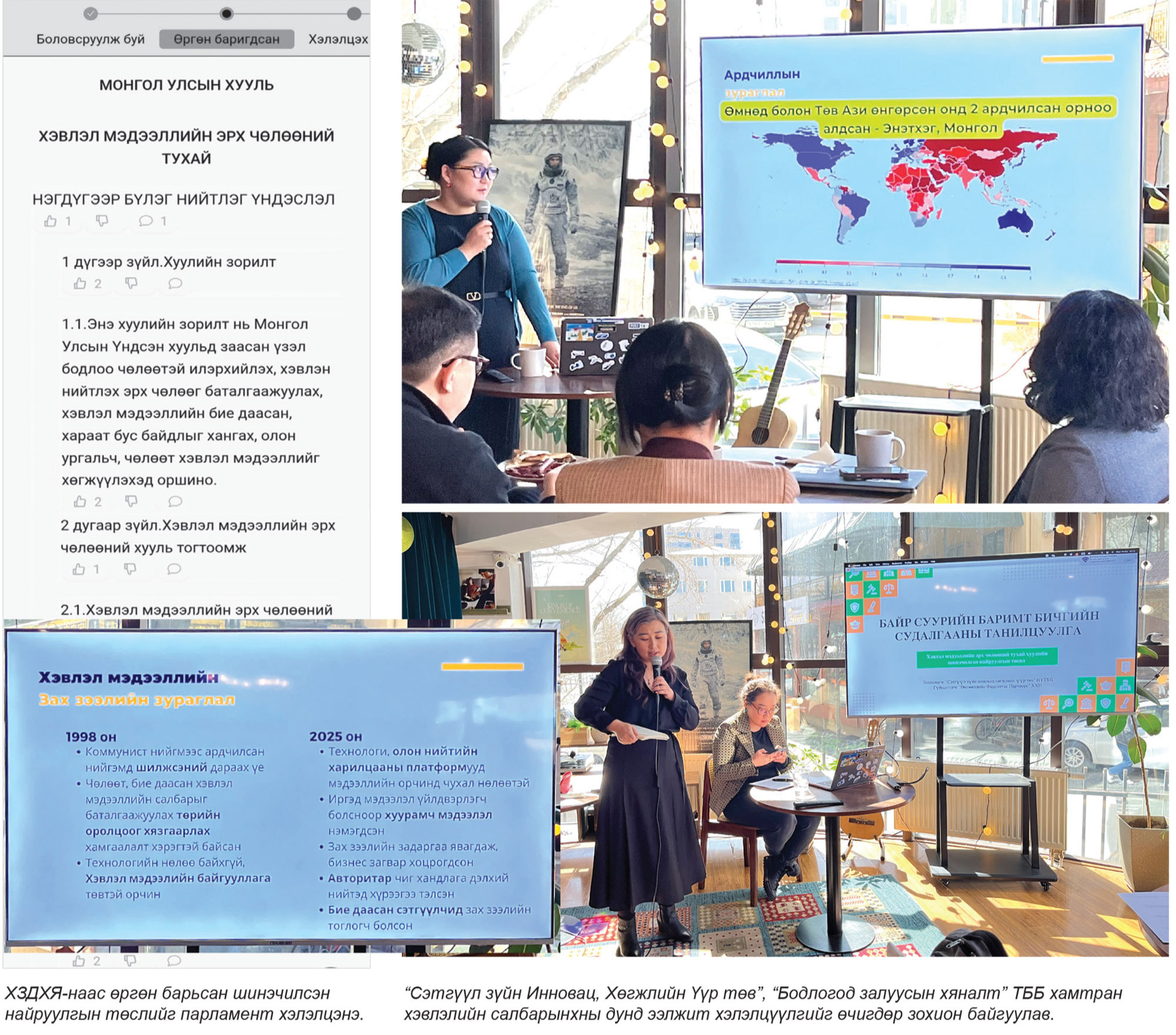 ХЗДХЯ-наас өнгөрсөн нэгдүгээр сард Хэвлэл мэдээллийн эрх чөлөөний тухай хуулийн шинэчилсэн найруулгын төслийг парламентад өргөн барьсан билээ. Улмаар хуулийн төслийг хаврын чуулганы хугацаанд хэлэлцэн батлахаар яригдаж байна. УИХ-ын Тамгын газраас мэдээлснээр, Хэвлэлийн эрх чөлөөтэй холбоотой хоёр ч хуулийн төсөл өргөн баригдсан бөгөөд ХЗДХЯ-наас гадна Ч.Лодойсамбуу нарын гишүүд Хэвлэлийн эрх чөлөөний тухай хуулийн төслийг өргөн мэдүүлжээ. Удахгүй хоёр хуулийн төсөл дээр ажлын хэсэг байгуулж, УИХ хэлэлцэх юм. Тэгвэл ХЗДХЯ-наас өргөн барьсан Хэвлэл мэдээллийн эрх чөлөөний тухай хуулийн шинэчилсэн найруулгын төслийн хүрээнд “Сэтгүүл зүйн Инновац, Хөгжлийн Үүр төв”, “Бодлогод залуусын хяналт” ТББ хамтран хэвлэлийн салбарынхны дунд ээлжит хэлэлцүүлгийг өчигдөр зохион байгуулав.