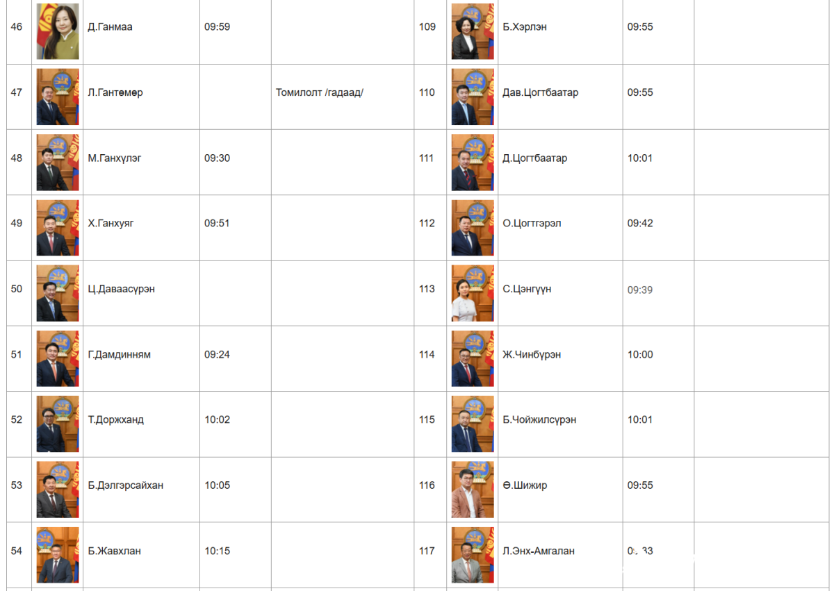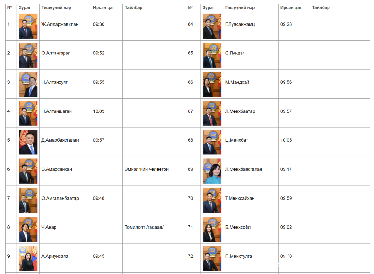 Монгол Улсын Их Хурлын 2025 оны хаврын ээлжит чуулганы нэгдсэн хуралдааны 03 дугаар сарын 27-ны өдрийн ирцийн мэдээг танилцуулж байна.