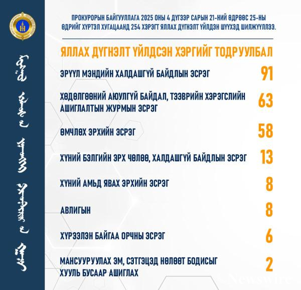 Прокурорын байгууллага 2025 оны 4 дүгээр сарын 21-ний өдрөөс 25-ны өдрийг хүртэл хугацаанд 254 хэрэгт яллах дүгнэлт үйлдэн шүүхэд шилжүүллээ.