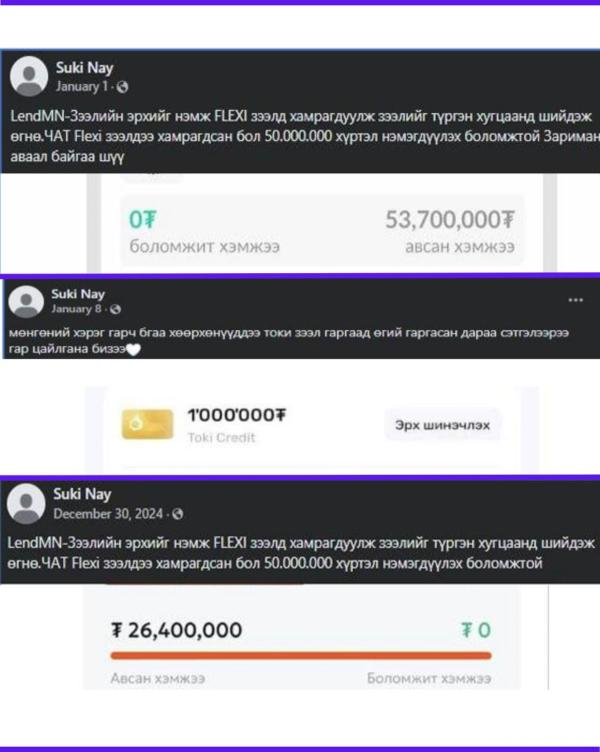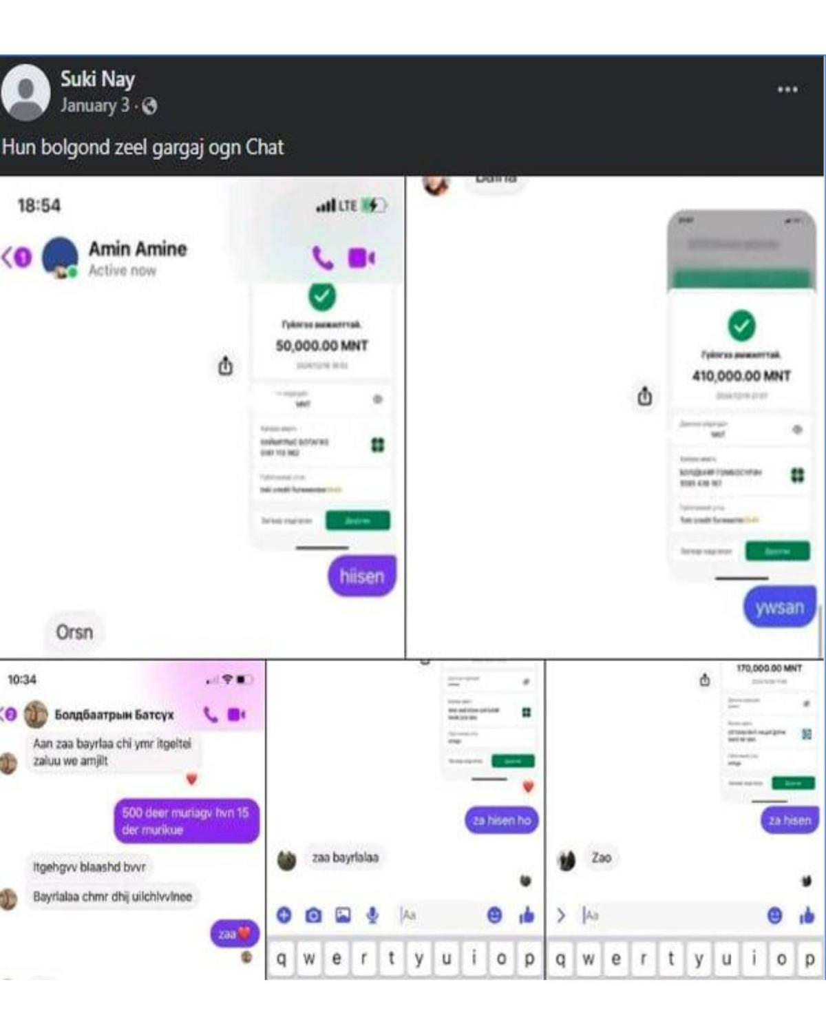 Шалгалтын явцад гэмт этгээдүүд нь тухайн үйлдлийн аргыг ашиглаж, олон иргэдийг хохироосон байж болзошгүй нөхцөл байдал тогтоогдож байгаа тул дээрх нэр бүхий цахим фэйсбүүк хаягтай холбогдон зээлийн аппликейшны эрхээ нэмэгдүүлэх гэж хувийн мэдээллээ өгч, залилах гэмт хэргийн хохирогч болсон иргэд цагдаагийн байгууллагын 8822-2255 дугаарт холбогдоно уу.