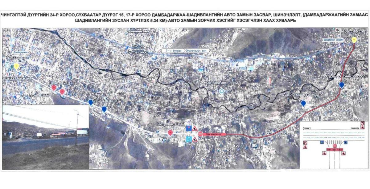 ЧД-ийн 24-р хороо, СБД-ийн 15,17-р хорооны нутаг дэвсгэр, Шадивлан зуслангийн авто замаас Дамбадаржаа хүртэлх авто замыг шинэчилж байна.
