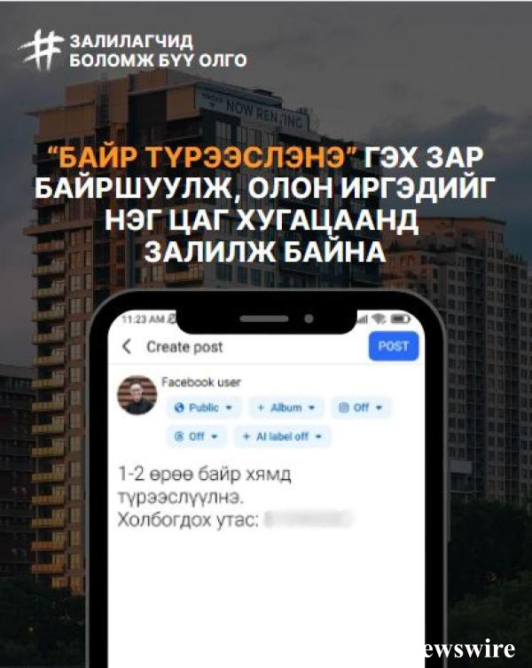 Иргэд та бүхэн амар хялбар аргаар мөнгө олох зорилготой этгээдүүдэд таны өмчлөх эрхэнд халдах боломжийг бүү олгоорой гэж ЦЕГ-аас мэдээллээ.