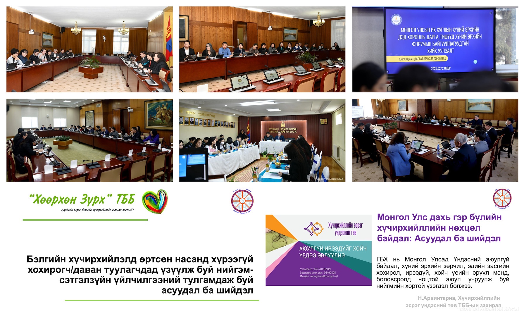 Улсын Их Хурлын Хүний эрхийн дэд хорооны дарга, гишүүдийн хүний эрхийн чиглэлээр үйл ажиллагаа явуулдаг иргэний нийгмийн байгууллагуудын төлөөлөлтэй хийдэг дөрөв дэх уулзалт “Байгаль орчны холбогдох хууль тогтоомж дахь хүний эрх хэрэгжилт” сэдвээр болж байсан бол гурав дахь уулзалт Шүүхийн шийдвэр гүйцэтгэх ерөнхий газрын харьяа сургалт-хүмүүжлийн тусгай байгууллага нийслэлийн ерөнхий боловсролын 110 дугаар сургууль дээр болж байсан юм.