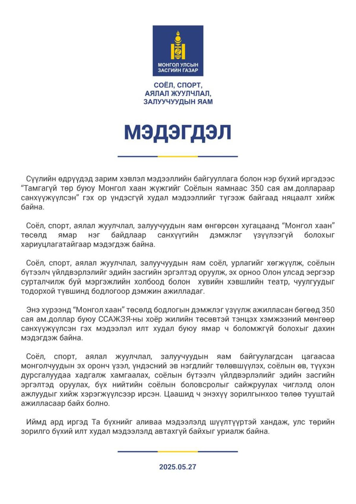 Соёл, спорт, аялал жуулчлал, залуучуудын яам өнгөрсөн хугацаанд “Монгол хаан” төсөлд ямар нэг байдлаар санхүүгийн дэмжлэг үзүүлээгүй болохыг хариуцлагатайгаар мэдэгдэж байна.