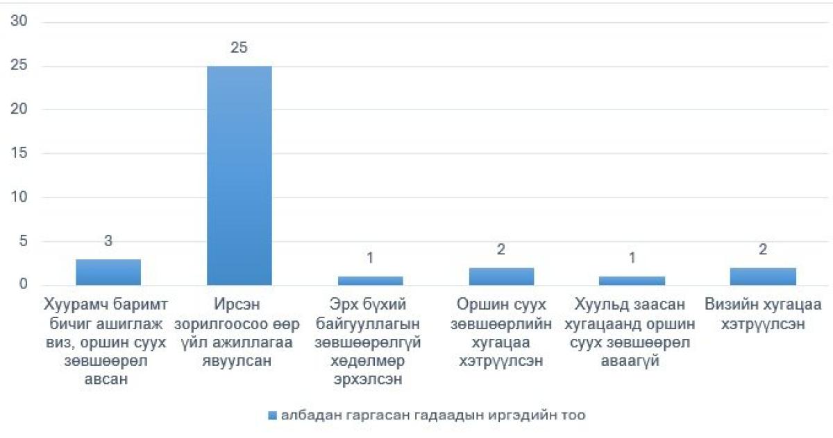 Эдгээр гадаадын иргэдийн 25 нь ирсэн зорилгоосоо өөр үйл ажиллагаа явуулсан бол 3 иргэн нь хуурамч баримт бичиг ашиглаж виз, оршин суух зөвшөөрөл авсан, 4 нь виз, оршин суух зөвшөөрлийн хугацаа хэтрүүлсэн үндэслэлээр тус тус албадан гаргагдсан байна.