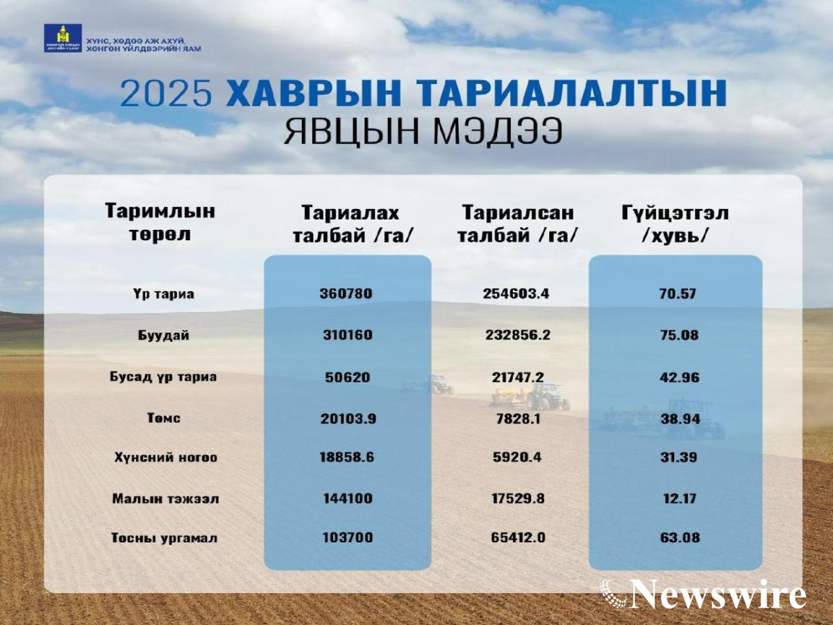 Улсын хэмжээгээр 2025 онд 360.7 мянган га-д үр тариа, үүнээс 310.1 мянган га-д улаанбуудай, 20.1 мянган га-д төмс, 18.8 мянган га-д хүнсний ногоо, 144.1 мянган га-д малын тэжээл, 103.7 мянган га-д тосны ургамал, өссөн дүнгээр 7.9 мянган га-д жимс жимсгэнэ, нийтдээ 655.5 мянган га-д тариалалт хийхээр зорилт тавьсан.