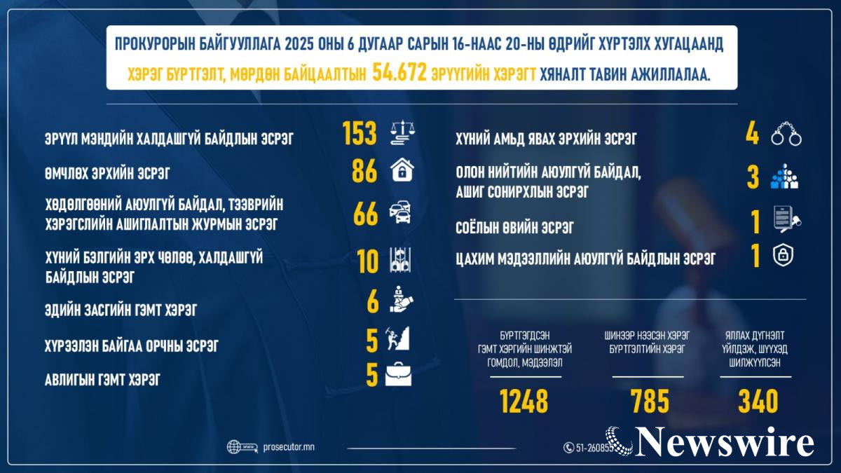 Прокурорын байгууллага 2025 оны 6 дугаар сарын 16-наас 20-ны өдрийг хүртэлх хугацаанд хэрэг бүртгэлт, мөрдөн байцаалтын 54,672 эрүүгийн хэрэгт хяналт тавин ажиллалаа.