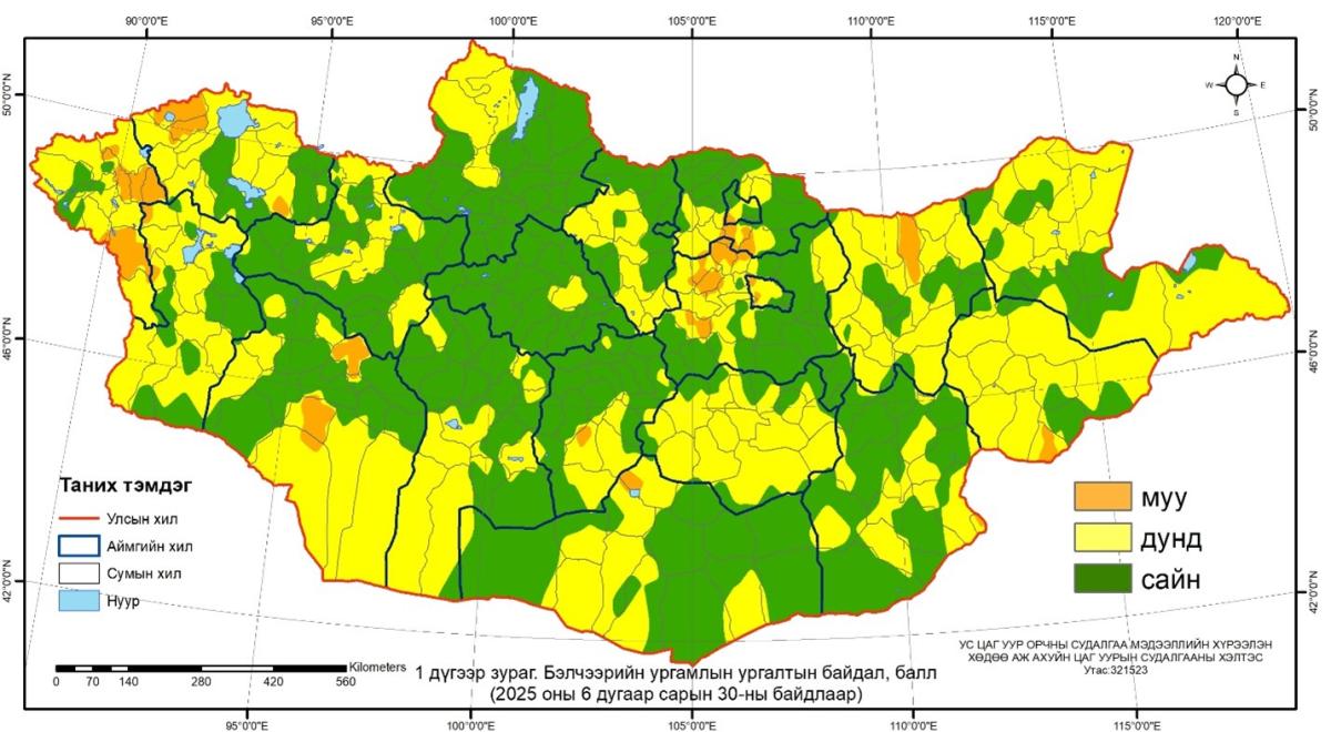 Цаг уурын байгууллагаас гаргадаг бэлчээрийн ургамлын ургалтын байдал зургадугаар сарын 30-ны байдлаар нийт нутгийн 51 хувьд гантай болон гандуу, 49 хувьд хэвийн буюу Баян-Өлгий, Увс, Говь-Алтай, Төвийн зарим нутгаар, Ховд, Өвөрхангай, Өмнөговь, Сэлэнгэ, Дархан-Уул, Хэнтий, Сүхбаатарын ганц нэг сумын нутгаар муу.