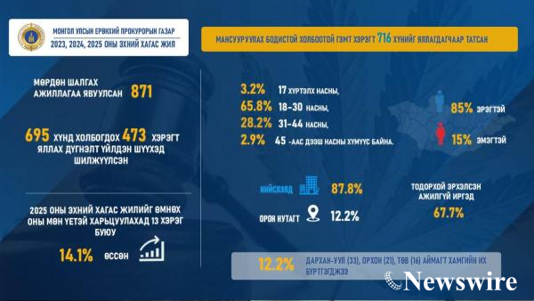 2025 оны эхний хагас жилд шүүхээс оногдуулсан ял шийтгэлийг 2024 оны эхний хагас жилтэй харьцуулахад хорих ял 12.5 хувиар, зорчих эрхийг хязгаарлах ял 53.3 хувиар тус тус өссөн.