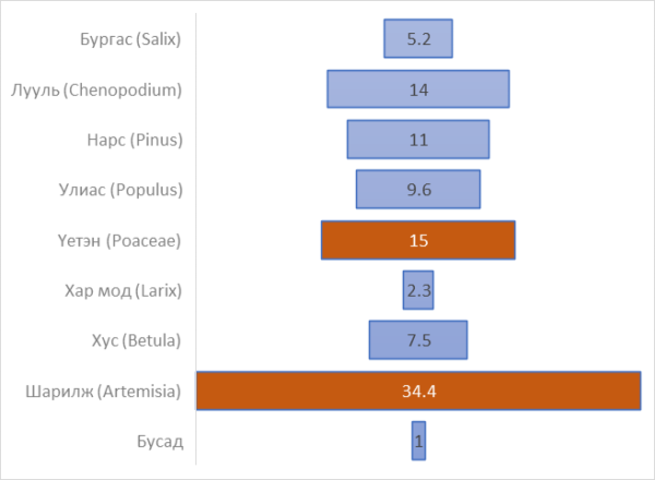 Мөн Улаанбаатар хотод хийсэн судалгаагаар нийт ургамлын тоосны 34,4%-ийг Аrtemisia, 15%-ийг Роасеае, 14%-ийг Chenороdium, 11%-ийг Рinus, 9,6%-ийг Рорulus, 7,5%-ийг Веtulа, 2,3%-ийг Larix, 0,1-1,0%-ийг Rаnunсulасeае, Роlygonасеае, Ulmасеае, Рараvегасеае, Саrуорhуlасеае, Fаbасеае, Legyminaсеае эзэлж байна (Зураг 1).