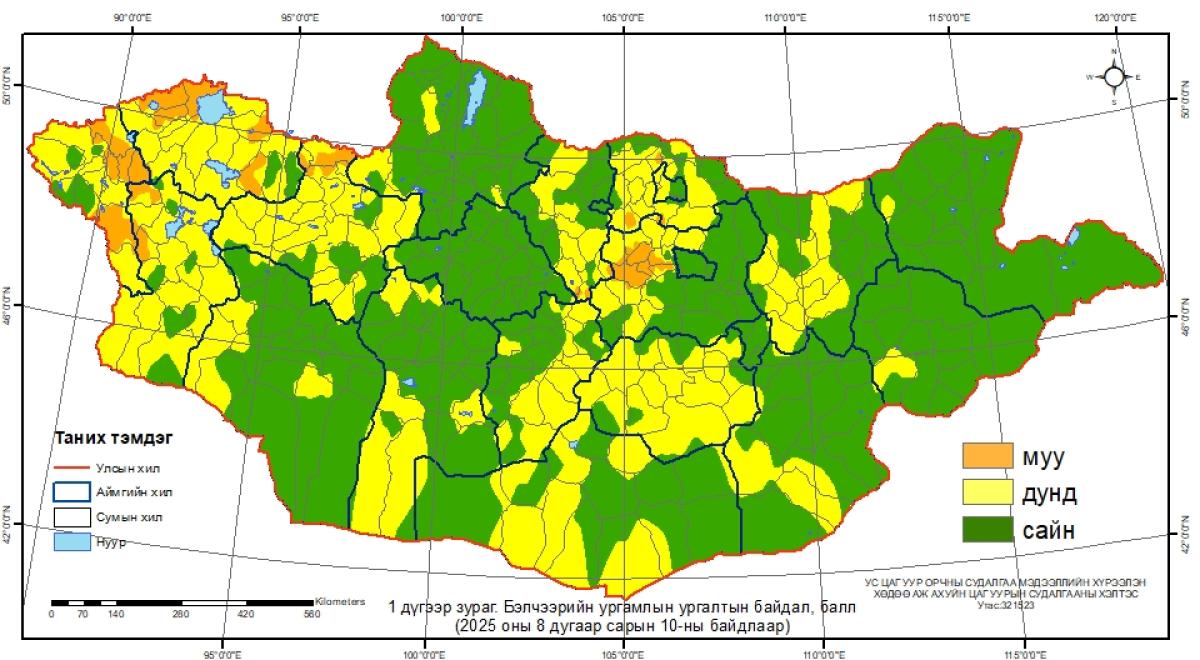 Цаг уурын байгууллагын гаргасан мэдээллээр бэлчээрийн ургамлын ургалтын байдал наймдугаар сарын 10-ны байдлаар нийт нутгийн 40 хувьд гантай болон гандуу, 60 хувьд хэвийн байна.