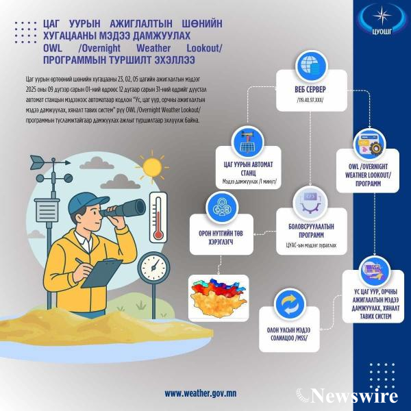 Цаг уур, орчны шинжилгээний газар 2025 оны 9-р сарын 01-нээс OWL буюу "Overnight Weather Lookout" программыг цаг уурын 3 өртөөнд туршилтаар нэвтрүүлэхэд бэлэн боллоо.