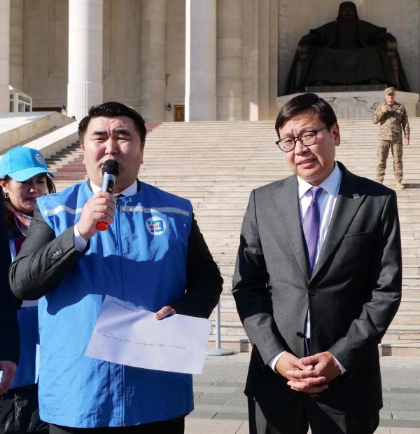 Боловсролын сайд П.Наранбаяр Сүхбаатарын талбай дээр гарч шаардлагын бичгийг хүлээн авлаа.