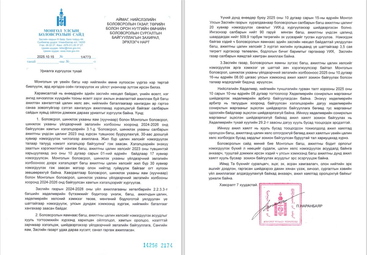 БОЛОВСРОЛЫН ЯАМ УРИАЛГА 2025.10.15АЙМАГ, НИЙСЛЭЛИЙН БОЛОВСРОЛЫН ГАЗАР, ТӨРИЙН БОЛОН ОРОН НУТГИЙН ӨМЧИЙН БОЛОВСРОЛЫН СУРГАЛТЫН БАЙГУУЛЛАГЫН ЗАХИРАЛ, ЭРХЛЭГЧ НАРТ