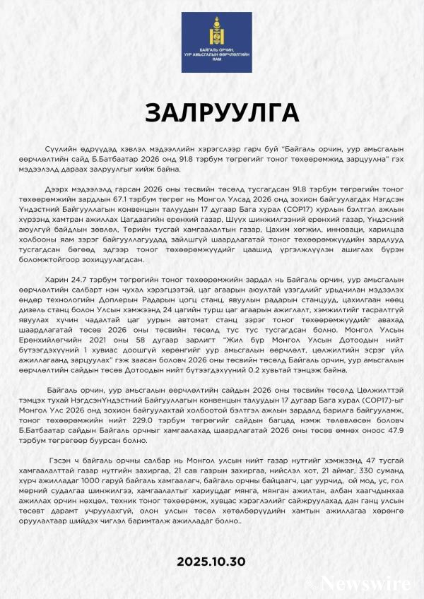 Байгаль орчин, уур амьсгалын өөрчлөлтийн яамнаас дараах залруулгыг гаргалаа.