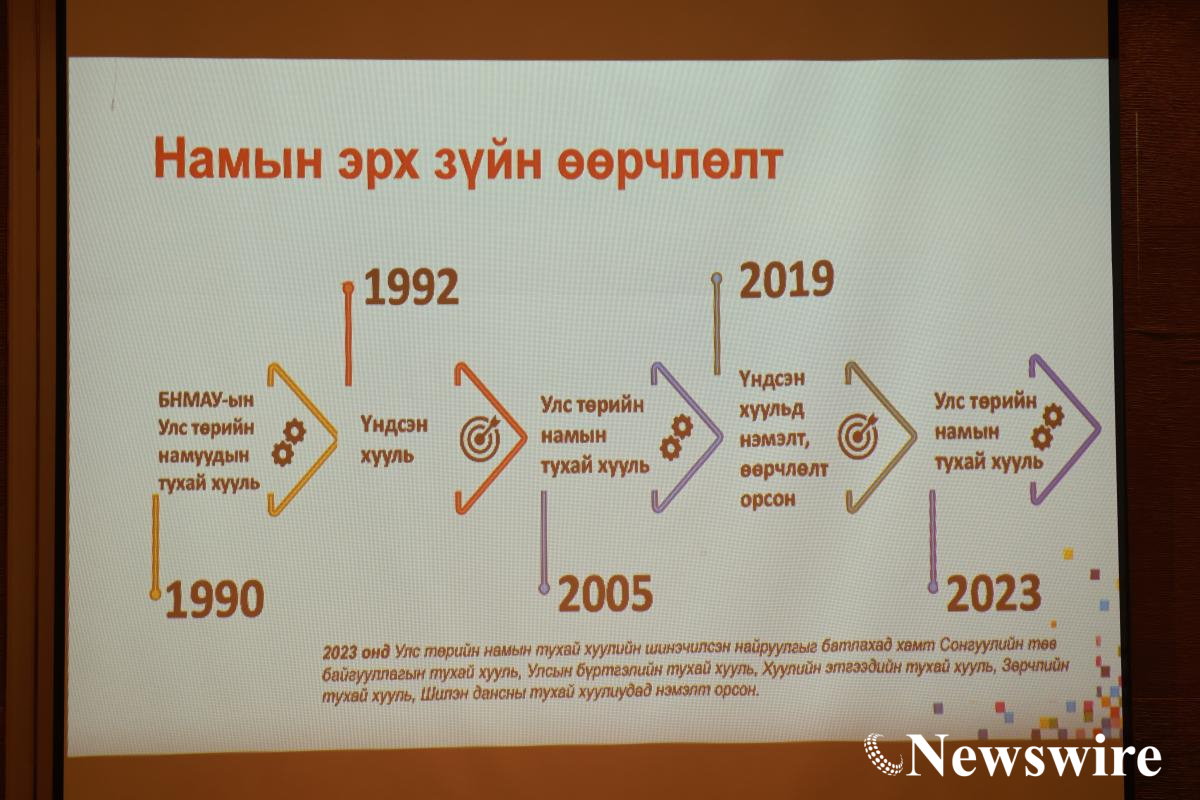МУБИС-ийн Нийгэм, хүмүүнлэгийн ухааны сургуулийн дэд профессор, улс төр судлалын доктор Э.Гэрэлт-Од “Улс төрийн намын эрх зүйн орчны өөрчлөлт, шинэчлэлт, тулгарч буй сорилтууд” илтгэлдээ намын эрх зүйн өөрчлөлтийн талаар харьцуулсан мэдээлэл өглөө. Үндсэн хуульд 2019 онд оруулсан нэмэлт, өөрчлөлтөөр улс төрийн намыг бодлогын, ил тод, ардчилсан байх тухай заалт орж, улс төрийн намуудын санаачилга, манлайллаар Улс төрийн намын тухай хууль (Шинэчилсэн найруулга) батлагдсан. Хуулийн үзэл баримтлалыг эвдэхгүйгээр хэрэгжүүлэх, парламентын ардчиллыг хөгжүүлэхэд улс төрийн намуудын оролцоо чухал. Хуулийн үзэл баримтлалд нийцүүлж намын дүрэм, журмаа шинэчлэх, дотоод ардчиллаа хангах сорилт тулгарч байгааг тэрбээр онцолсон юм. Түүнчлэн ёс зүйн буюу бичигдээгүй хэм хэмжээ, хандлага болох дотоод соёл, гишүүдийн хандлагыг өөрчилж, хууль хэрэгжүүлэх хүсэл зоригтой байхын чухлыг тэрбээр тодотголоо.