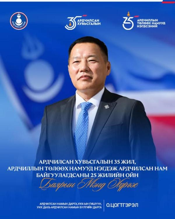 Та бүхэндээ Ардчиллын төлөөх намууд нэгдэн нягтарч, өнөөгийн Ардчилсан намыг байгуулсан түүхт 25 жилийн ойн баярын мэндийг хүндэтгэн дэвшүүлье.