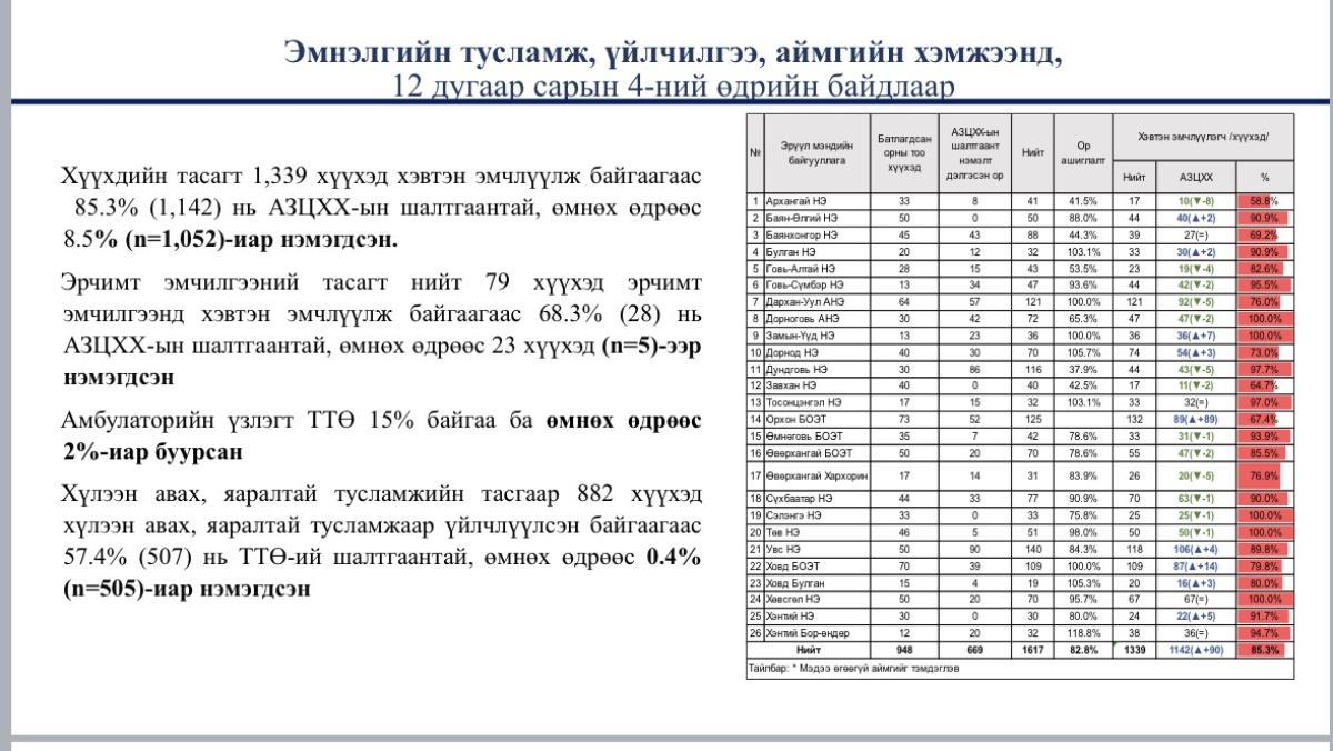 - Улсын хэмжээнд 2025 оны 12 дугаар сарын 03-ны өдрийн мэдээгээр амбулаторийн үзлэг, яаралтай тусламжийн тасагт эзлэх томуу төст өвчлөлийн хувь буурах хандлагатай ч эмнэлэгт хэвтэж байгаа хүүхдийн тоо өссөн үзүүлэлттэй байна.