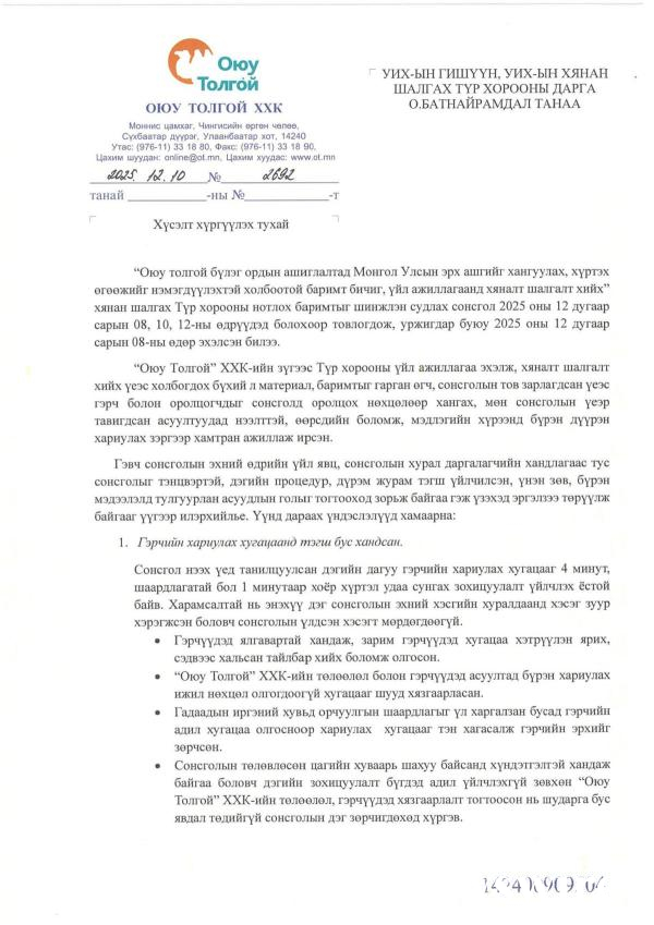 Улсын Их Хурлын 2025 оны 62 дугаар тогтоолоор байгуулагдсан Оюутолгойн бүлэг ордын ашиглалтад Монгол Улсын эрх ашгийг хангуулах, хүртэх өгөөжийг нэмэгдүүлэхтэй холбоотой баримт бичиг, үйл ажиллагаанд хяналт шалгалт хийх Улсын Их Хурлын хянан шалгах түр хорооны нотлох баримтыг шинжлэн судлах сонсгол өнөөдөр (2025.12.10) үргэлжилнэ.