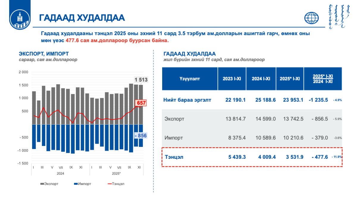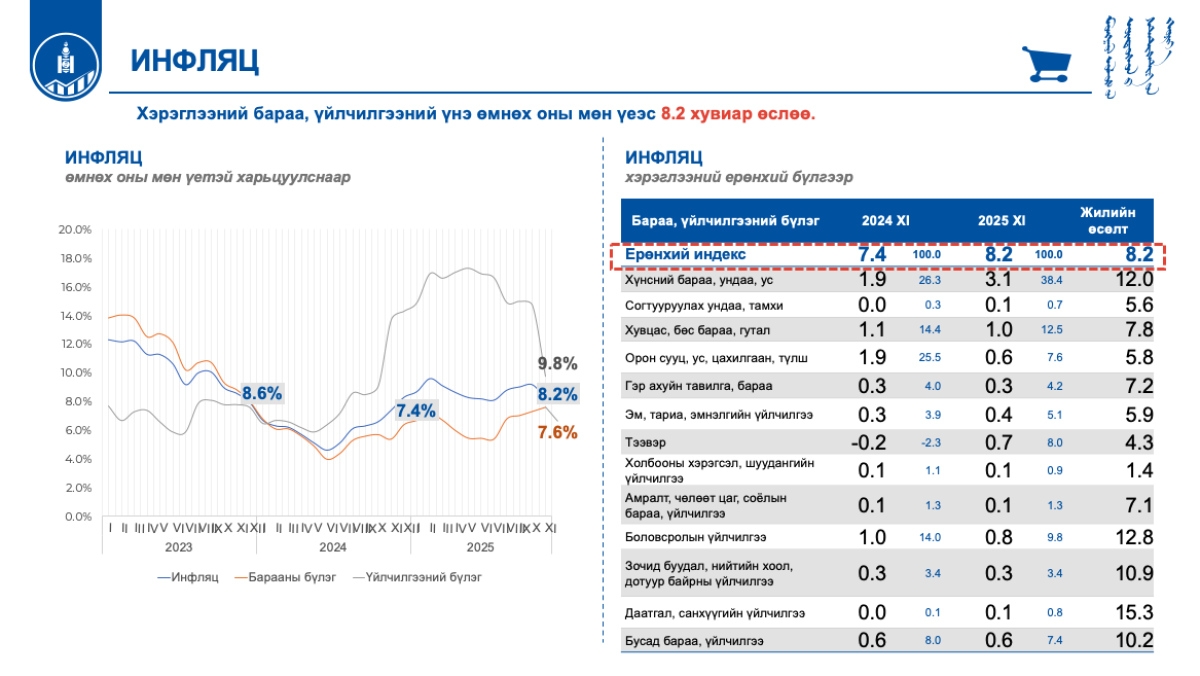 Монгол Улсын нийгэм, эдийн засгийн байдлын 2025 оны эхний 11 сарын танилцуулгыг ҮСХ-ны Эдийн засгийн статистикийн газрын Мөнгө, санхүү, үйлчилгээний статистикийн хэлтсийн дарга Л.Энхбаатар танилцуулж байна.