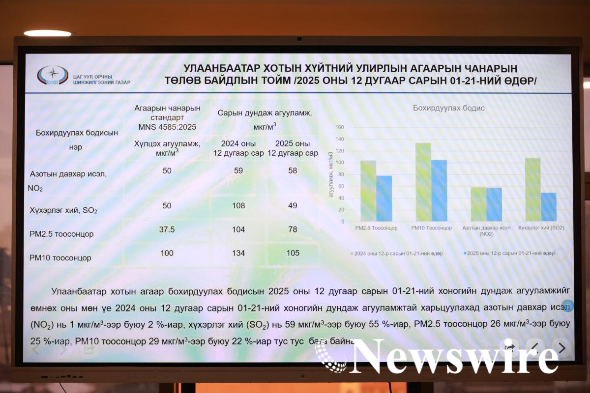 Цаг уур орчны шинжилгээний газрын ахлах мэргэжилтэн Д.Өнөрбат агаар бохирдуулагч гол бодисуудын 2025 оны сүүлийн улирлын үзүүлэлтийг өнгөрсөн оны мөн үетэй харьцуулан танилцуулсан юм. Тодруулбал, хүхэрлэг хий 2024 оны 12 дугаар сард 108 мкг/м3 байсан бол 2025 оны 12 дугаар сард 49 мкг/м3 болж, 55 хувиар буурчээ. Мөн PM2.5 болон PM10 тоосонцор 22-25 хувиар, азотын давхар исэл 2 хувиар буурсан байна.