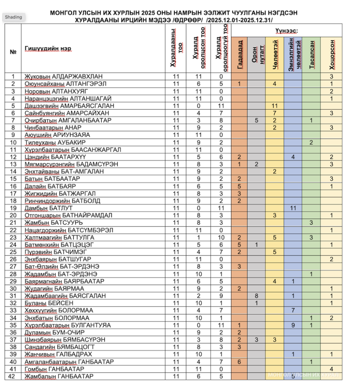 Монгол Улсын Их Хурлын 2025 оны намрын ээлжит чуулганы нэгдсэн хуралдааны 12 дугаар сарын ирцийн мэдээ.