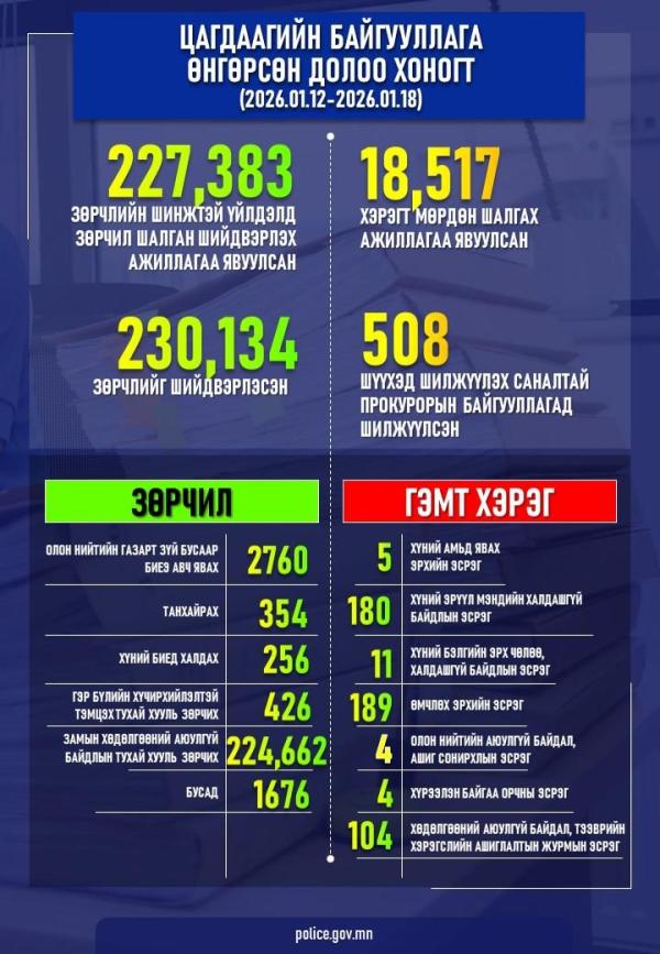 Цагдаагийн байгууллагаас өнгөрсөн 7 хоногт 18,517 хэрэгт мөрдөн шалгах ажиллагааг явуулж, өнгөрсөн долоо хоногт (2026.01.12-оос 2026 оны 01 дүгээр сарын 18-ны өдрүүдэд) 508 хэргийг шүүхэд шилжүүлэх саналтай прокурорын байгууллагад хүргүүлсэн байна.