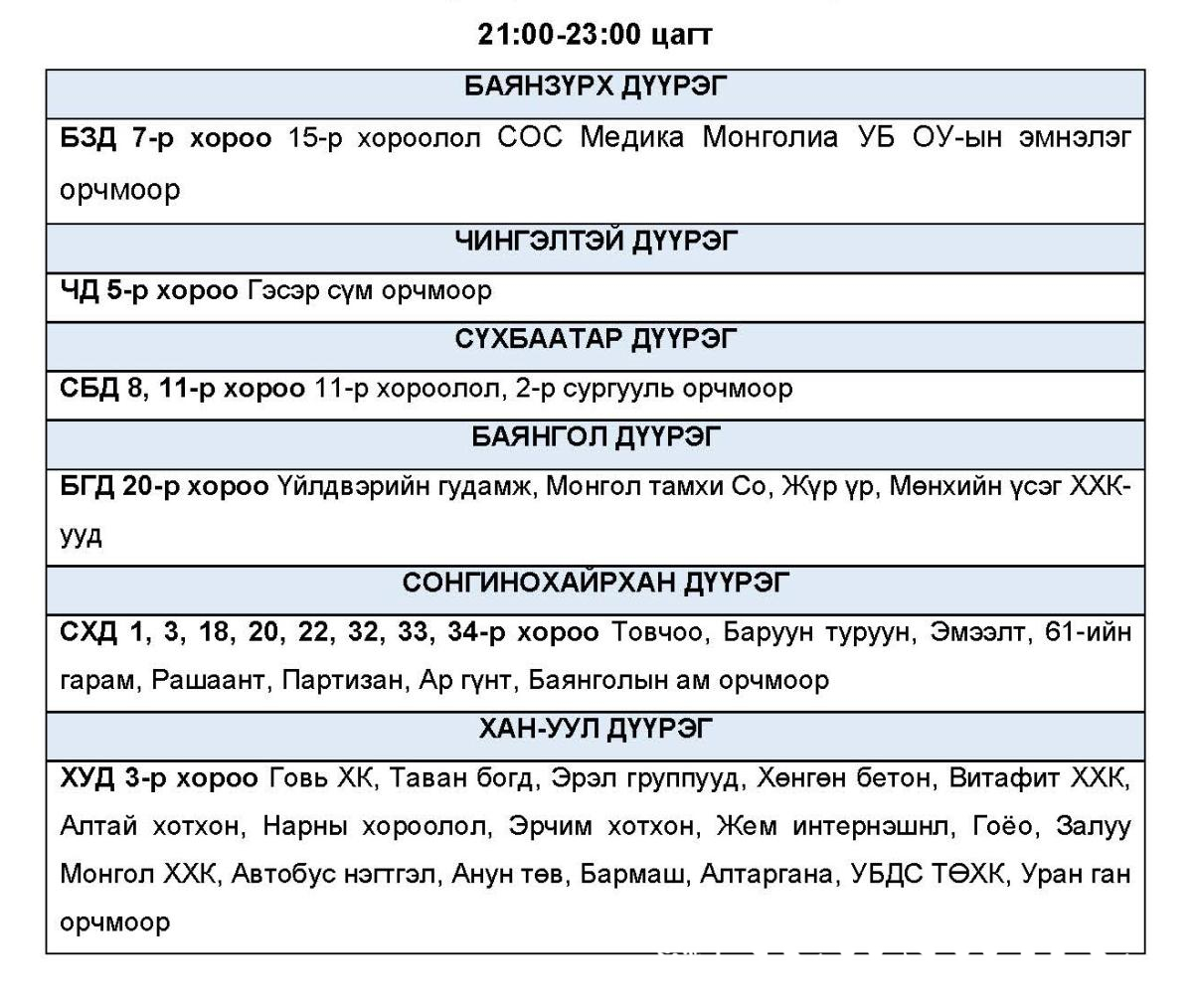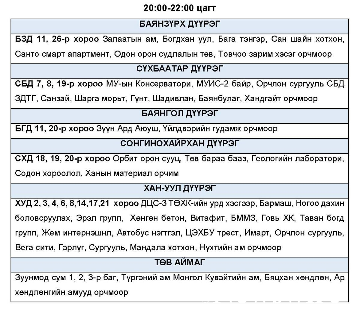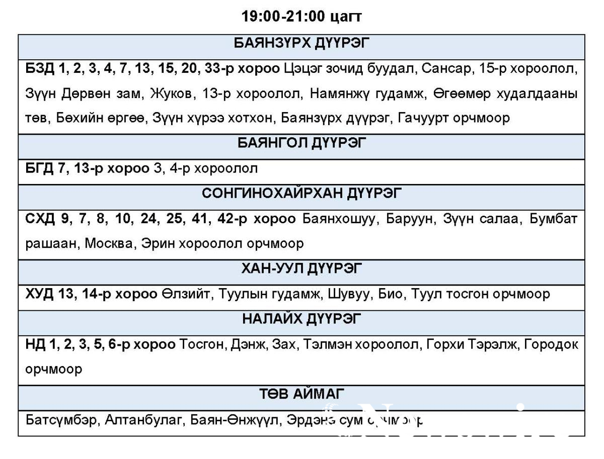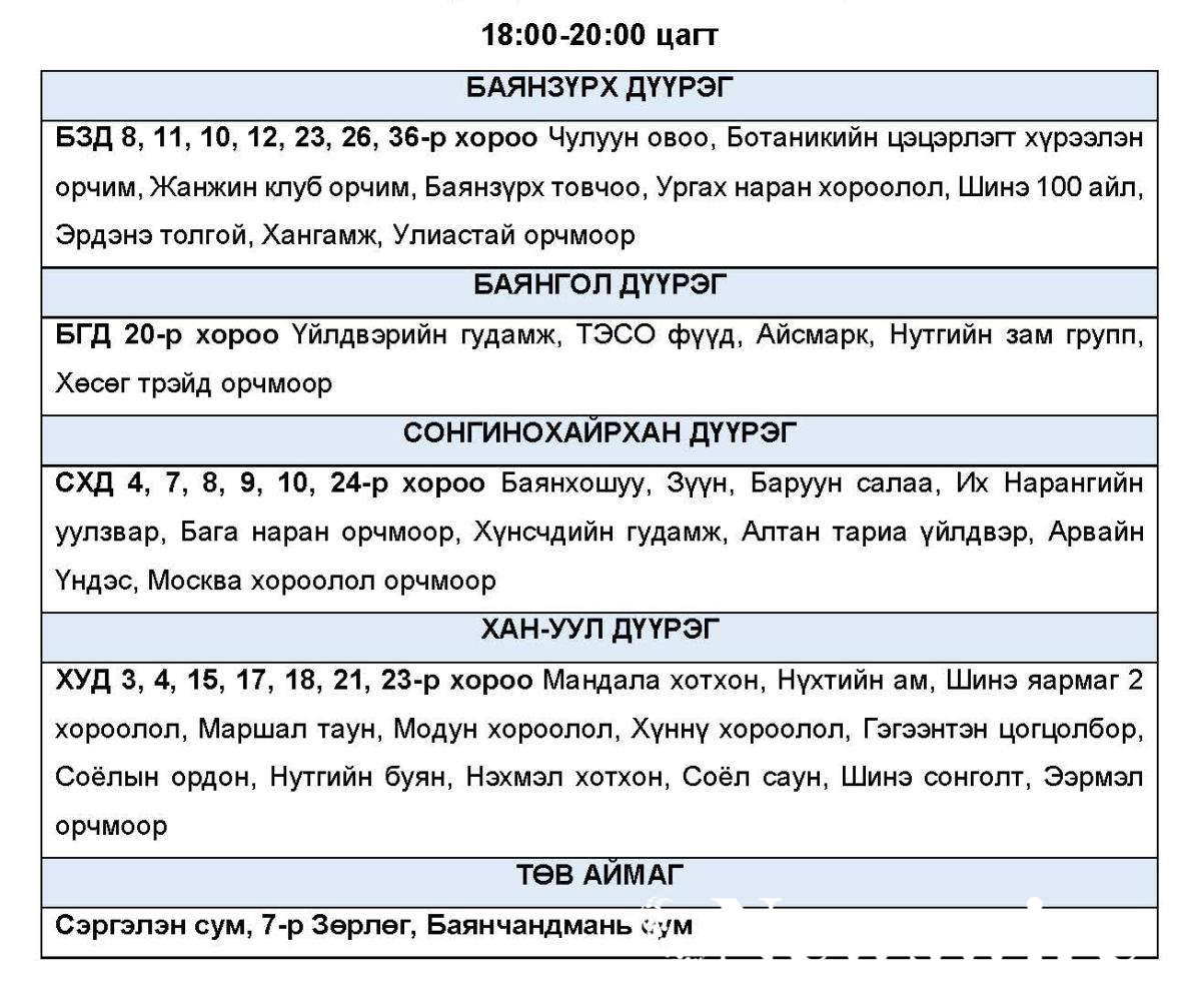 Эрчим хүчний системд аваарын горим үүсэхээс сэргийлэн нэгдсэн сүлжээнд холбогддог тодорхой байршлуудад цахилгаан эрчим хүчний төлөвлөсөн хэрэглээг “Диспетчерийн үндэсний төв” ТӨХХК-ийн шийдвэрээр хуваарийн дагуу 2 цагийн хугацаатай хязгаарлах арга хэмжээ авч байна.
