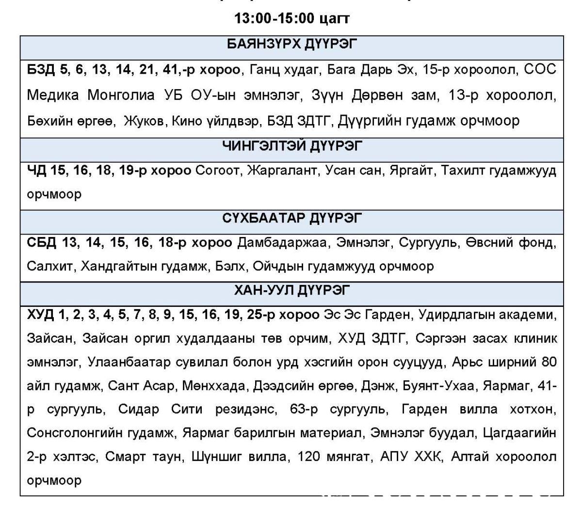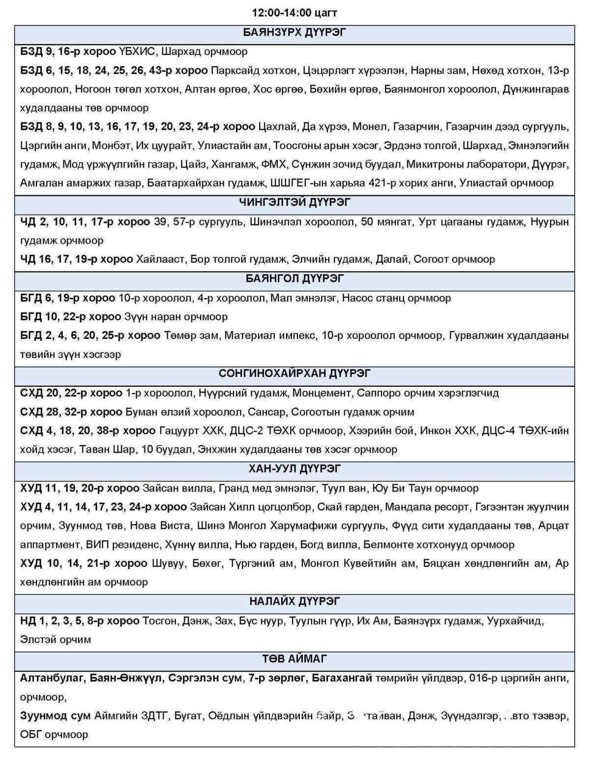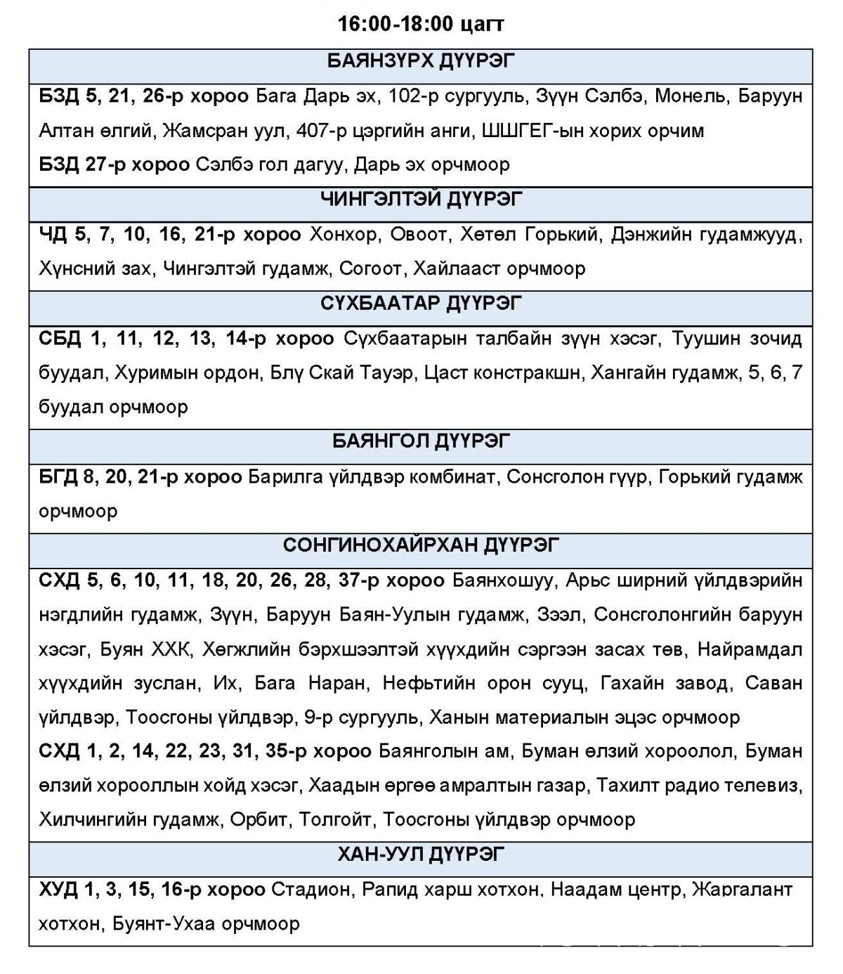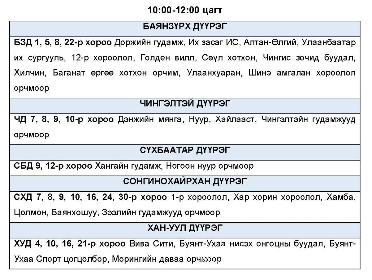 Эрчим хүчний системд аваарын горим үүсэхээс сэргийлэн нэгдсэн сүлжээнд холбогддог тодорхой байршлуудад цахилгаан эрчим хүчний төлөвлөсөн хэрэглээг “Диспетчерийн үндэсний төв” ТӨХХК-ийн шийдвэрээр хуваарийн дагуу 2 цагийн хугацаатай хязгаарлах арга хэмжээ авч байна.