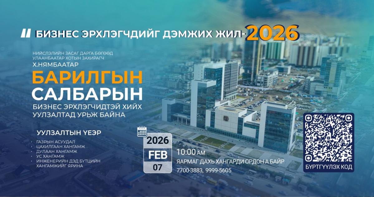 Нийслэл 2026 оныг бизнес эрхлэгчдийг дэмжих жил болгон зарласан. Энэ хүрээнд 02 дугаар сарын 07-ны өдөр нийслэлийн Засаг дарга бөгөөд Улаанбаатар хотын Захирагч Х.Нямбаатар барилгын салбарын бизнес эрхлэгчидтэй уулзана. Улаанбаатар хотын Худалдааны танхимтай хамтран зохион байгуулж байгаа тус уулзалтаар нийслэлийн газрын асуудал, цахилгаан, дулаан, ус хангамж, инженерийн дэд бүтцийн хангамжийн асуудлуудын талаар ярилцаж, санал солилцоно.