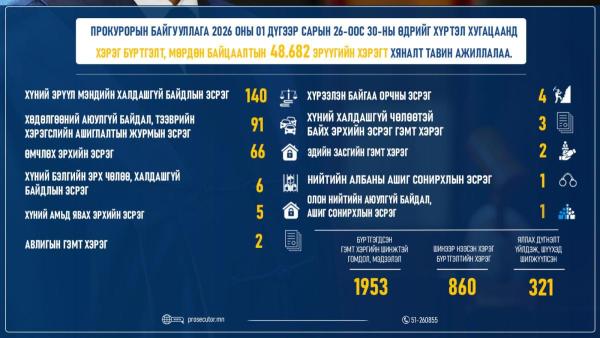 Прокурорын байгууллага 2026 оны 01 дүгээр сарын 26-ны өдрөөс 30-ны өдрийг хүртэлх хугацаанд хэрэг бүртгэлт, мөрдөн байцаалтын 48,682 эрүүгийн хэрэгт хяналт тавин ажиллажээ. Дээрх хугацаанд 1953 гэмт хэргийн шинжтэй гомдол, мэдээлэл бүртгэгдсэн бол хэрэг бүртгэлтийн 860 хэрэг шинээр нээж, 321 хэрэгт прокурор яллах дүгнэлт үйлдсэн байна.