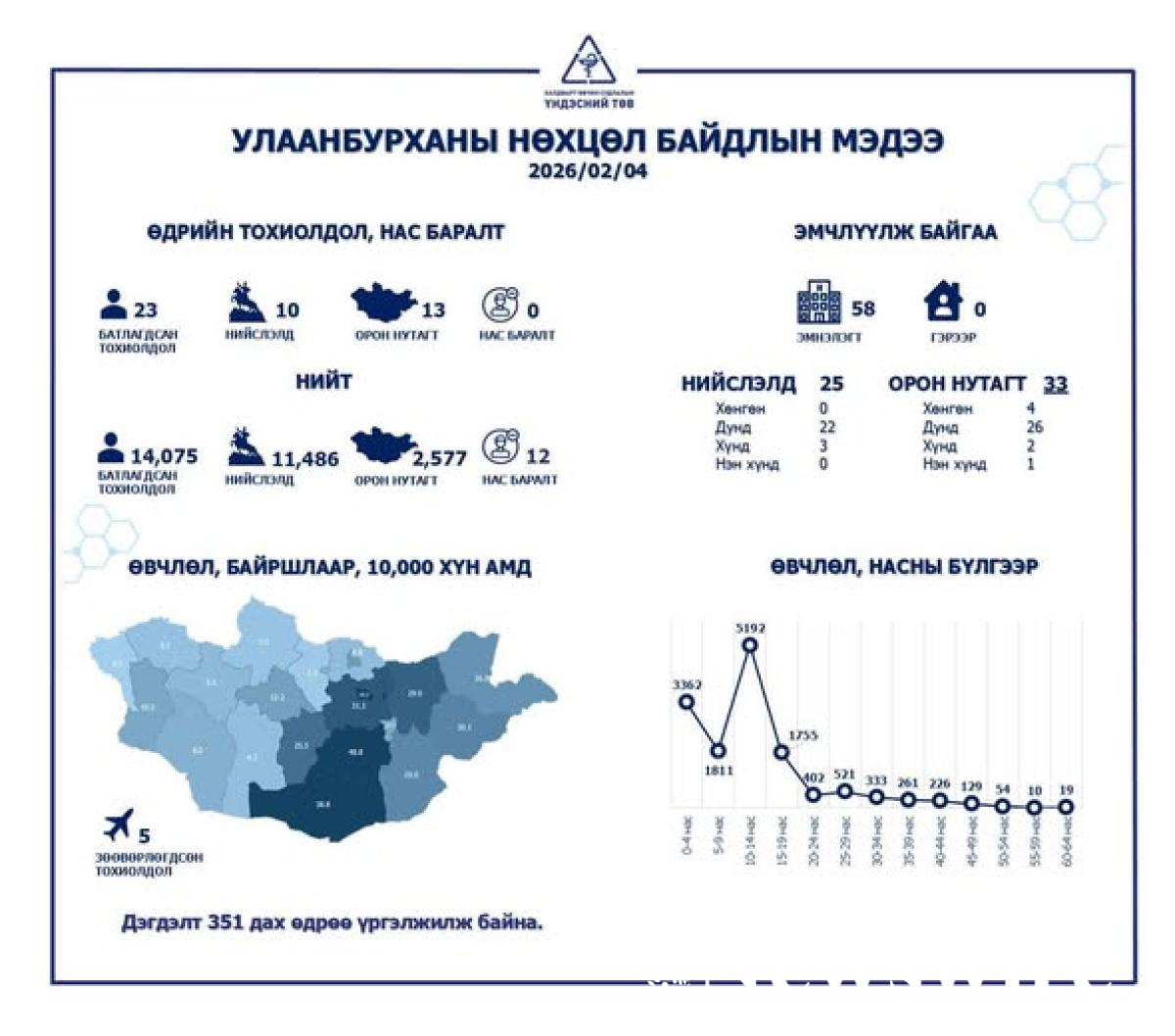Халдварт өвчин судлалын үндэсний төвийн захирал, АУ-ны доктор С.Энхболдын мэдээлснээр 2026 оны хоёрдугаар сарын 3-ны байдлаар сүүлийн 24 цагт улаанбурхан өвчний батлагдсан 25 тохиолдол бүртгэгдсэн. Өнөөдрийн байдлаар ХӨСҮТ-д 21 хүүхэд хэвтэн эмчлүүлж байгаагаас Эрчимт эмчилгээний тасагт 6 сартай нэг хүүхэд хүнд оноштойгоор эмчлүүлж байна. Улсын хэмжээнд улаанбурхан өвчний нийт батлагдсан тохиолдол 14 мянга бүртгэгдсэн ба үүний 70 хувийг вакцины бүрэн тунд хамрагдаагүй болон огт вакцинд хамрагдаагүй хүүхдүүд эзэлж байгаа аж.
