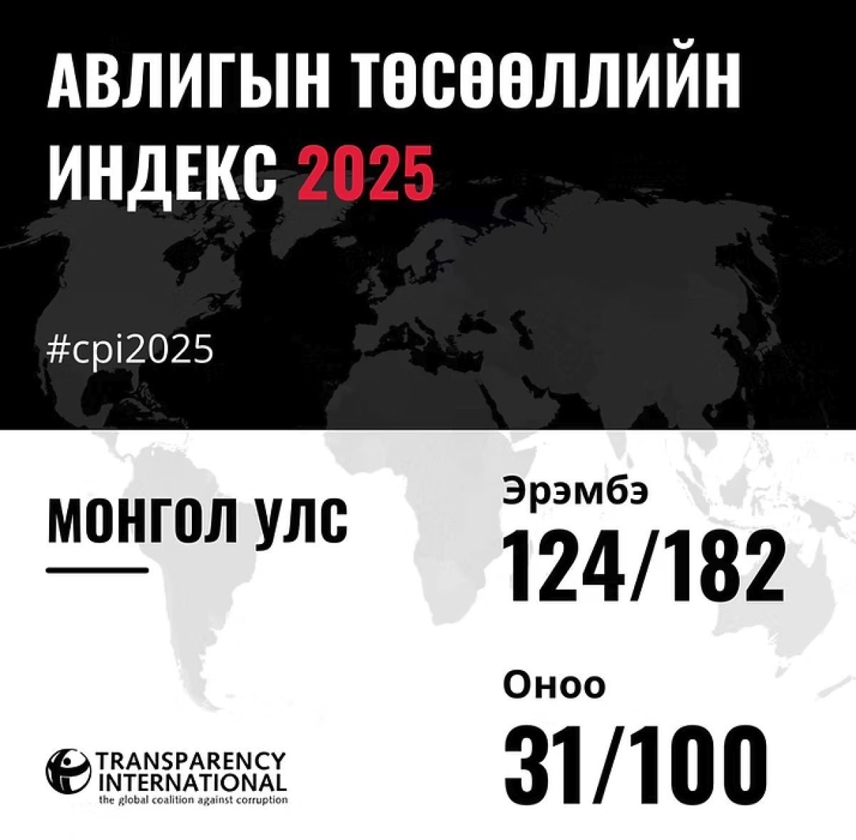 Олон Улсын "Транспэрэнси Интернэшнл" байгууллагаас жил бүр авлигын төсөөллийн индексийг зарладаг бөгөөд өнгөрөгч 2025 оны дүнг өнөөдөр /2025.02.10/ зарлалаа.