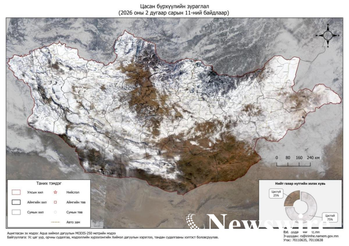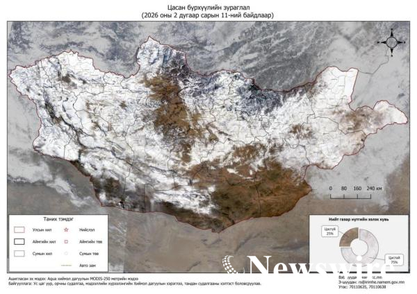 Монгол орны нийт нутгийн 75 хувьд цасан бүрхүүлтэй байна.
