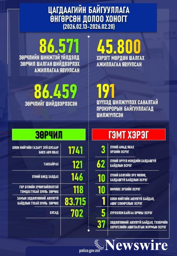 Цагдаагийн байгууллага өнгөрсөн 7 хоногт (2026 оны 02 дугаар сарын 13-ны өдрөөс 2026 оны 02 дугаар сарын 20-ны өдрүүдэд) 191 хэргийг “Шүүхэд шилжүүлэх саналтай” Прокурорын байгууллагад хүргүүлсэн.